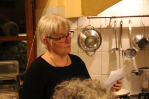 L’accueil chaleureux, un verre de vin chaud pour nous réchauffer et nous redonner de l’énergie, la soirée s’annonçait sous les meilleurs auspices. Nos hôtes avaient laissé mijoter sur le feu de bois, dans la grande cheminée,une « soupe-à-tout » dans la marmite en fonte suspendue à la crémaillère. Elle était si bonne que bon nombre d’entre nous on dit qu’elle avait un goût de « revenez-y ». Auberge espagnole : chacun ayant apporté quiches, cake, ail des ours, pâté, tartes et autres desserts sucrés et boissons que nos chauffeurs habituels avaient pris soin de transporter dans leurs voitures depuis le pont.